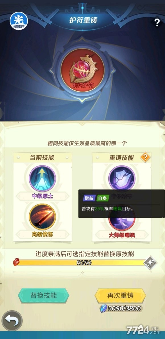 相同技能就只生效最高品质的一个,技能是可以替换的,玩家也可以保留之前的技能,有洗出好的属性就可以进行提升。玩家可以解锁各种不同的技能效果,大师级嘲讽,普攻有25%的概率可以嘲讽目标,高级愤怒,可以提升15%的输出伤害,还有各种不同的护符。